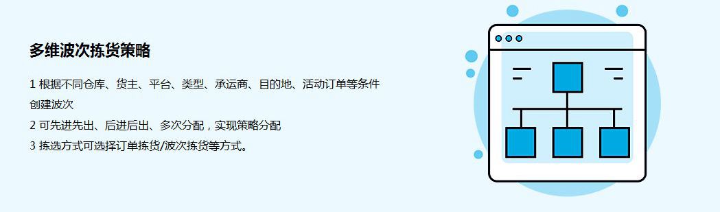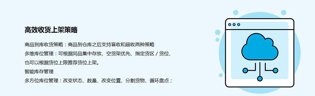 系統(tǒng)支持靈活多變的收貨策略、上架策略、補貨策略、揀貨策略、分配策略、盤點策略、波次策略和出庫策略等。
